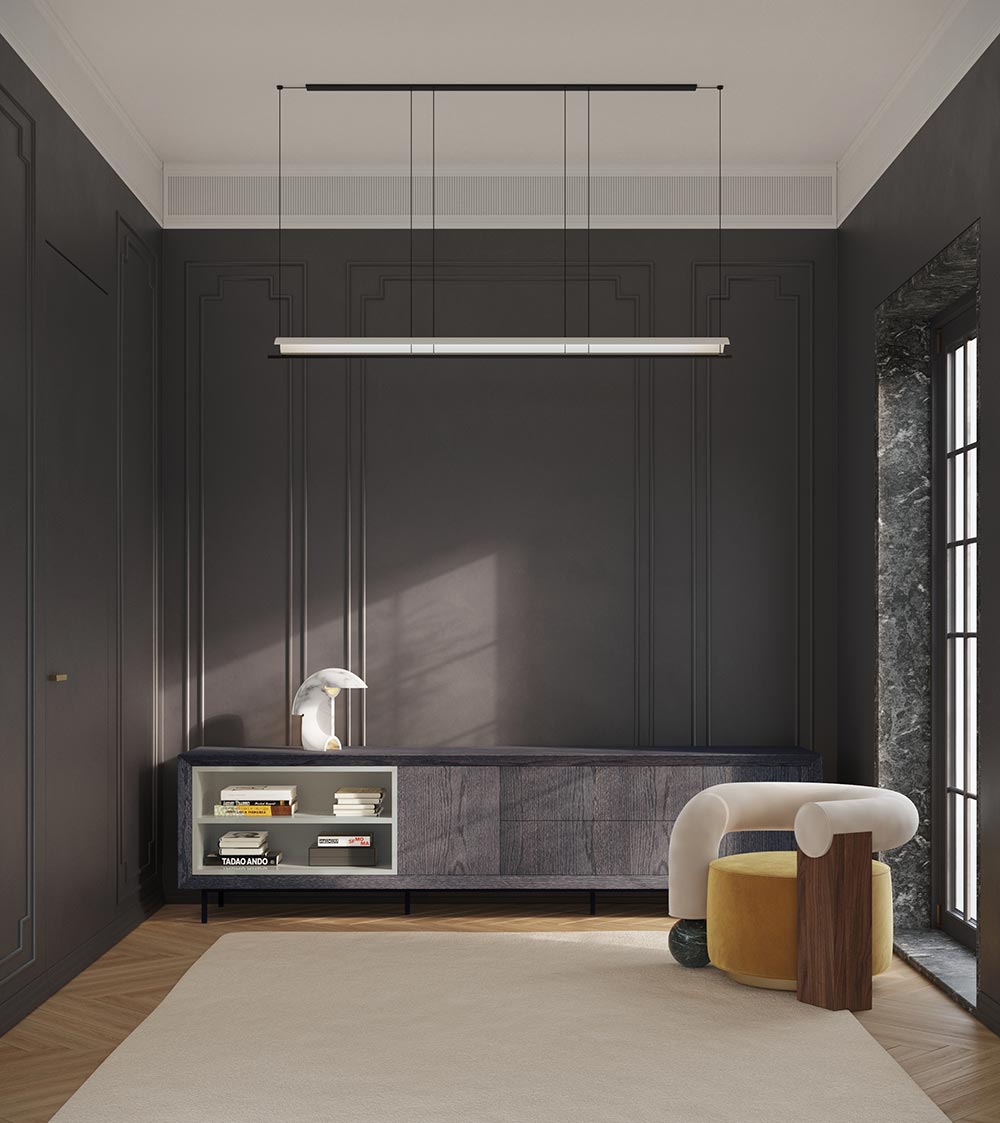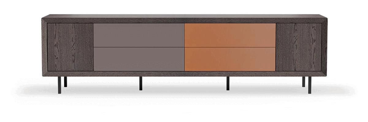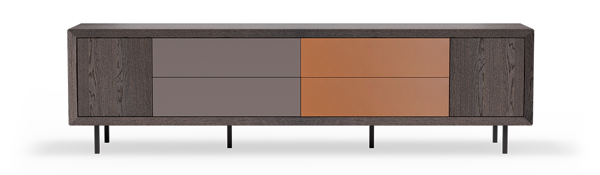 Su configuración ofrece una adaptabilidad sin límites. Recubierto por una envolvente firme pero elegante, alberga tres tipos de módulos: decorativos, cajoneras y puertas con balda interior, que permiten crear hasta 31 combinaciones por cada módulo. Además de dos propuestas de soporte, patas de hierro negro con peana o versión flotante.
