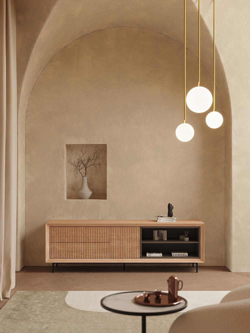 El nombre KOA nace de la cueva de Zaldibia, de aquella cavidad primigenia que fue refugio y cobijo de los primeros tesoros de nuestra historia. Hoy, el aparador KOA recoge ese espíritu para transformarlo en un mueble que protege y realza lo que guarda.